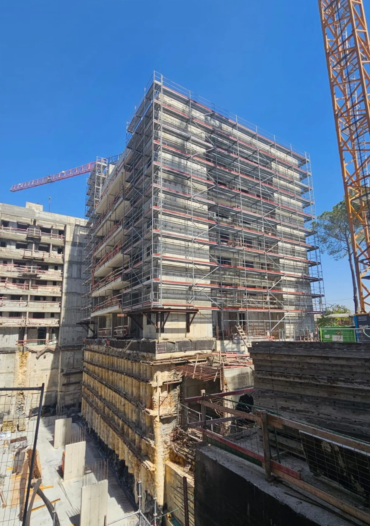 פיגום זקפים (מודולרי) – מבנה פלדה יציב עם כושר נשיאה גבוה, מתאים לבנייה רוויה לגובה רב.
